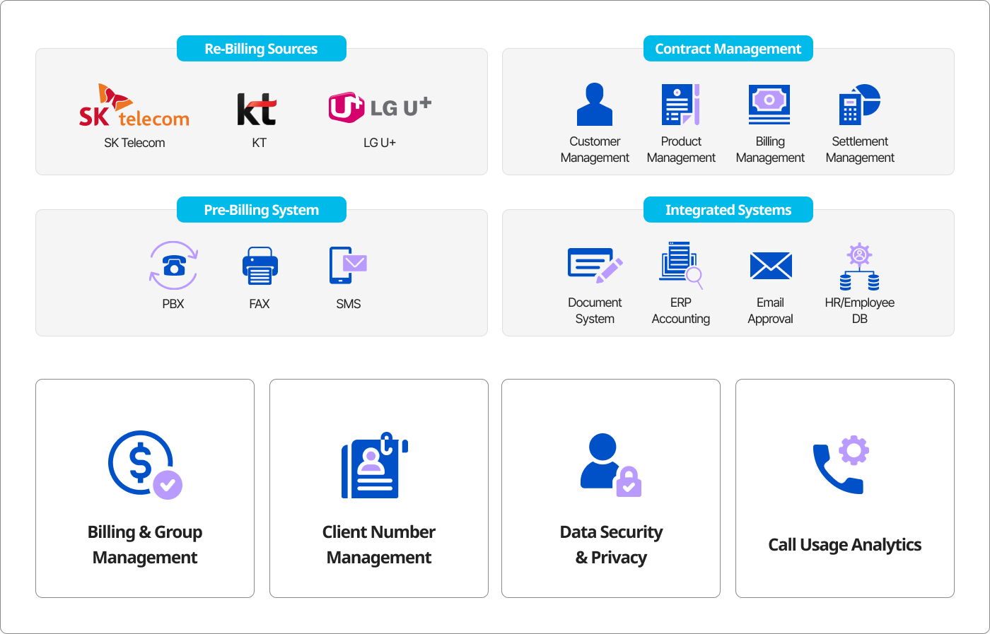 Billing solution that handles billing-related operations such as charge calculation, invoicing, and payment collection for subscribers using communication services. Depending on the operational model, it can be configured as a re-billing package or a contract-based package, and can also be deployed in a hybrid configuration with a pre-billing system.