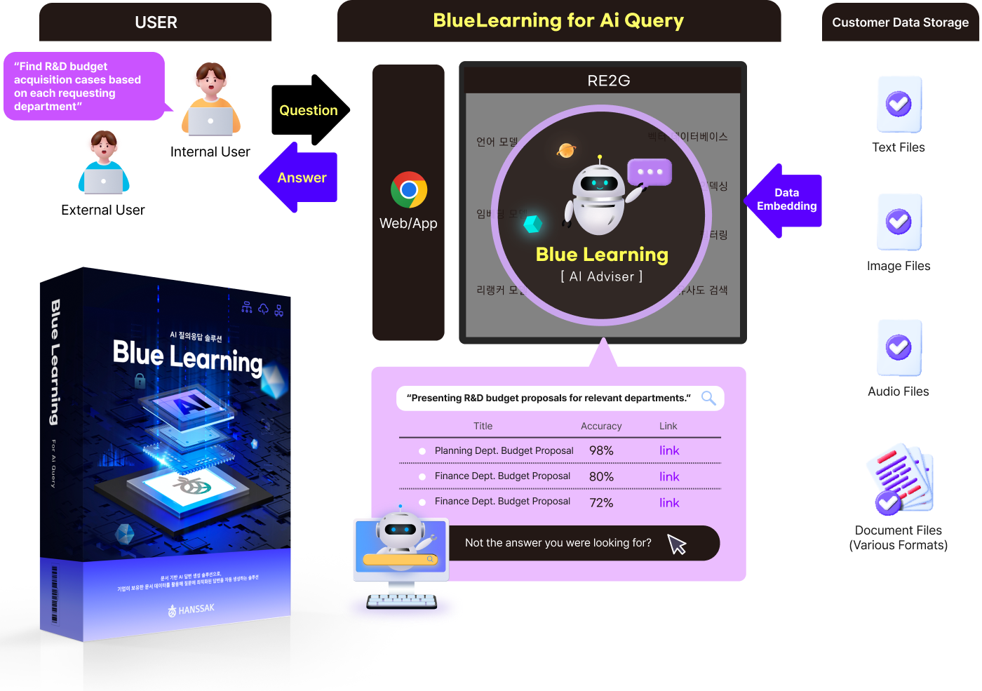 BlueLearning is an AI solution that performs natural-language question answering based on customer data, delivering a new level of user experience through document search and probabilistic accuracy scoring. It is designed for large-scale document environments requiring high security, such as public-sector and education institutions.