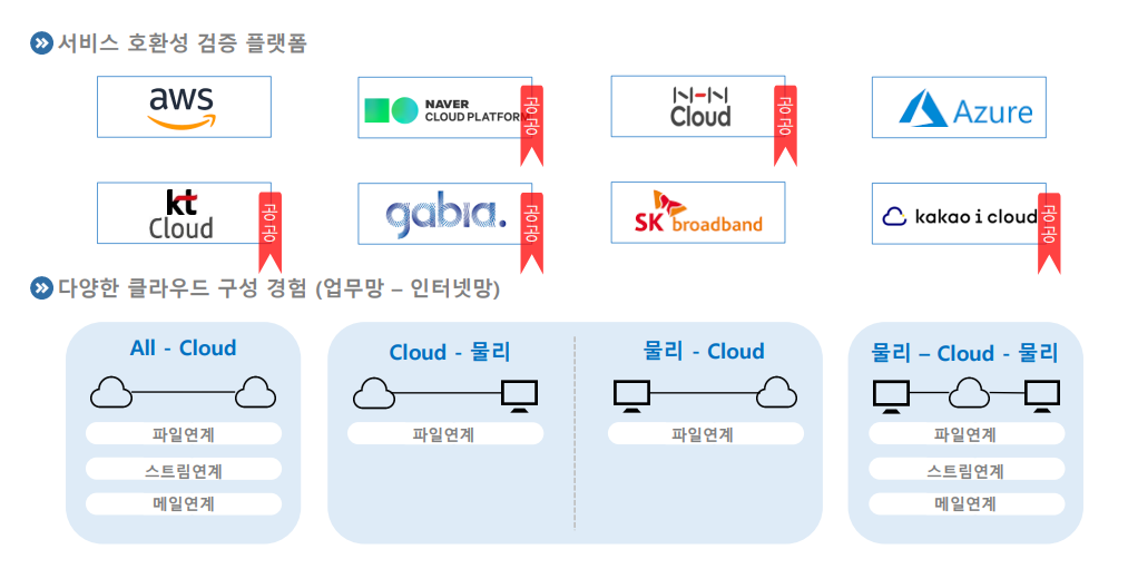 시큐어게이트는 현재 네이버, NHN, KT 등 국내 주요 클라우드 마켓플레이스에 등록되어 있으며, 자료연계와 스트림연계를 구독형 서비스로 제공 중이다. 해당 서비스는 카카오와 가비아의 클라우드 플랫폼에서도 동일하게 지원하고 있다.