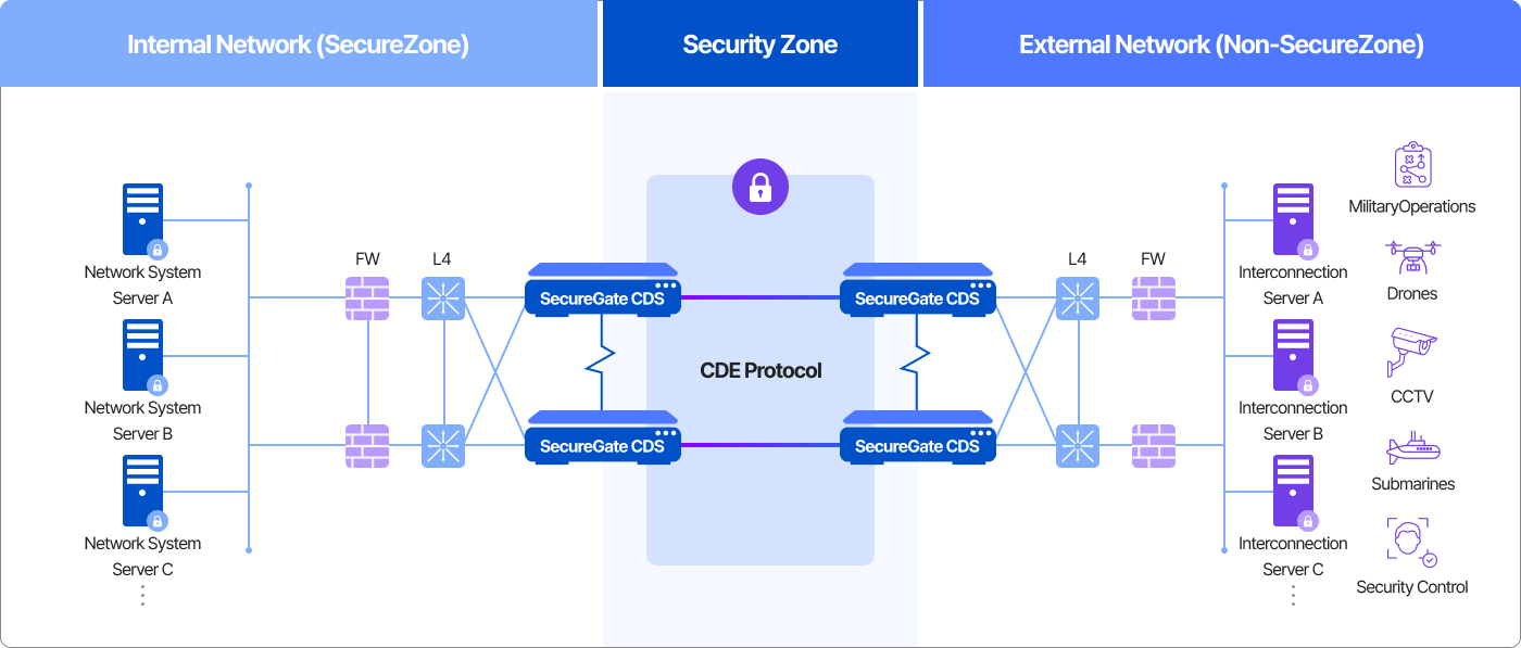 A next-generation security solution designed to strengthen transmission data control between defense systems with different security classifications, developed through the transfer of security control technologies from the National Security Research Institute.
